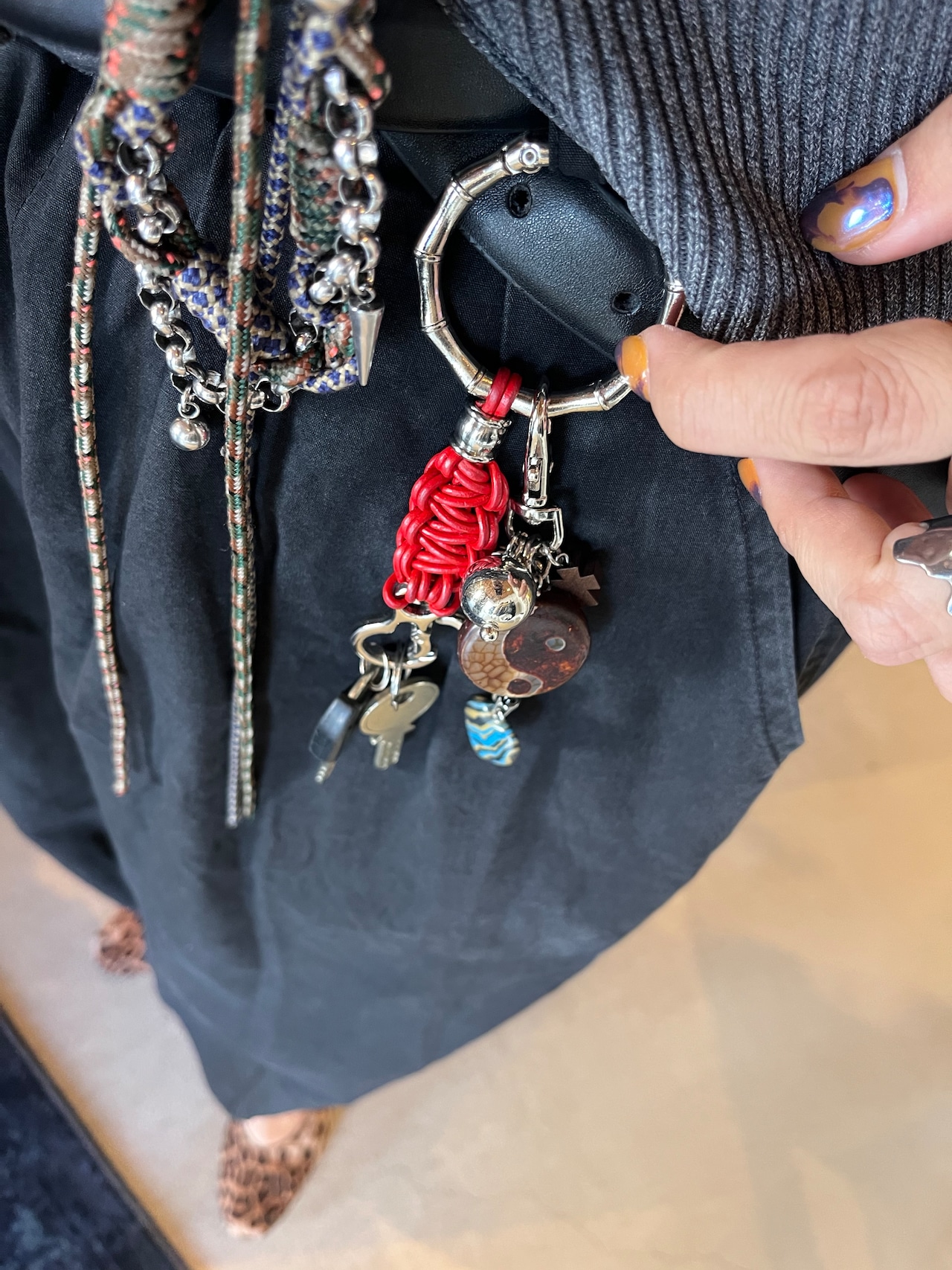 バッグにつけたり、鍵をつけてベルトループに通したり。