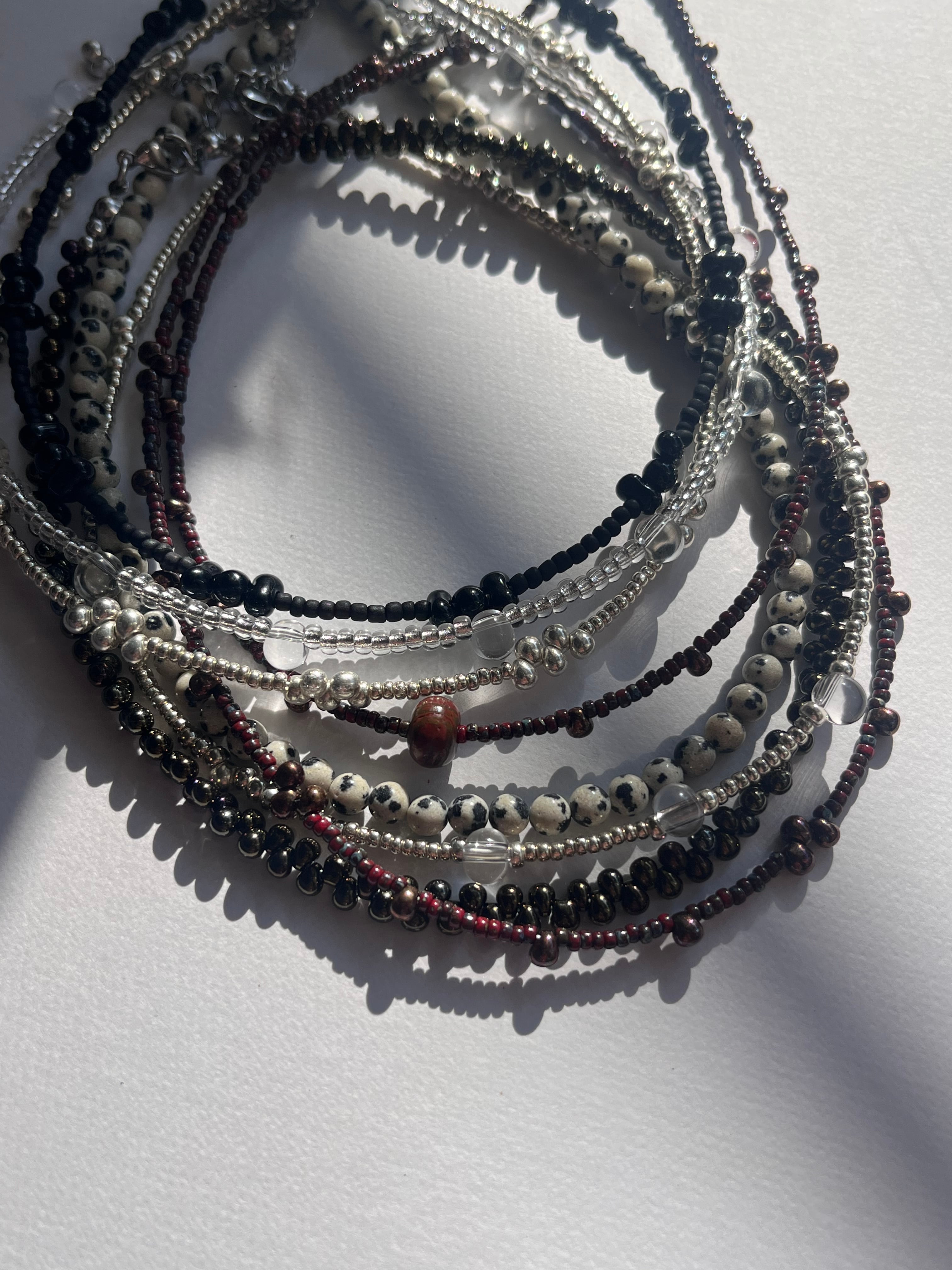 シンプルに並べたビーズは首にフィットしてどんなコーデにも馴染みます。