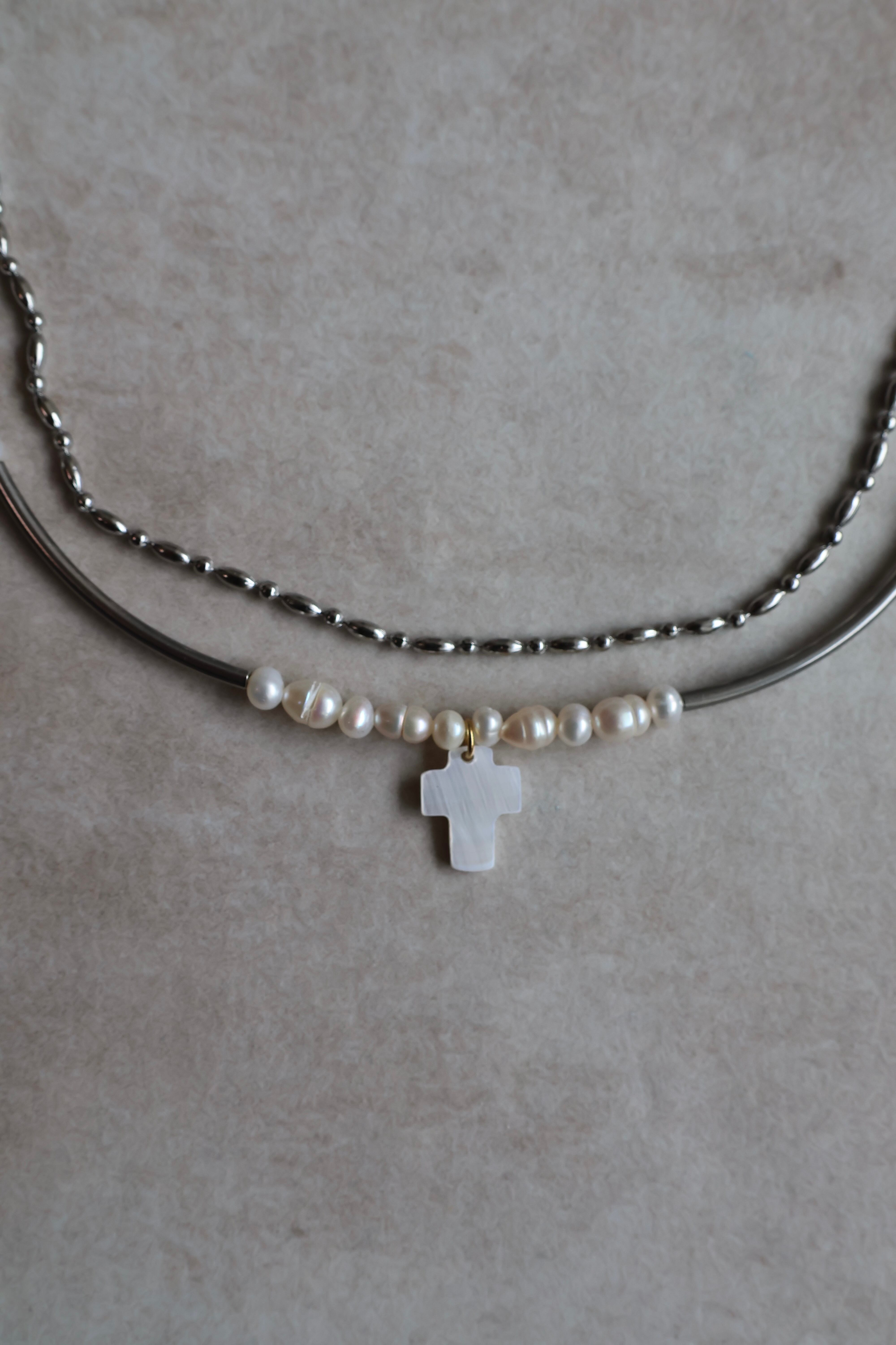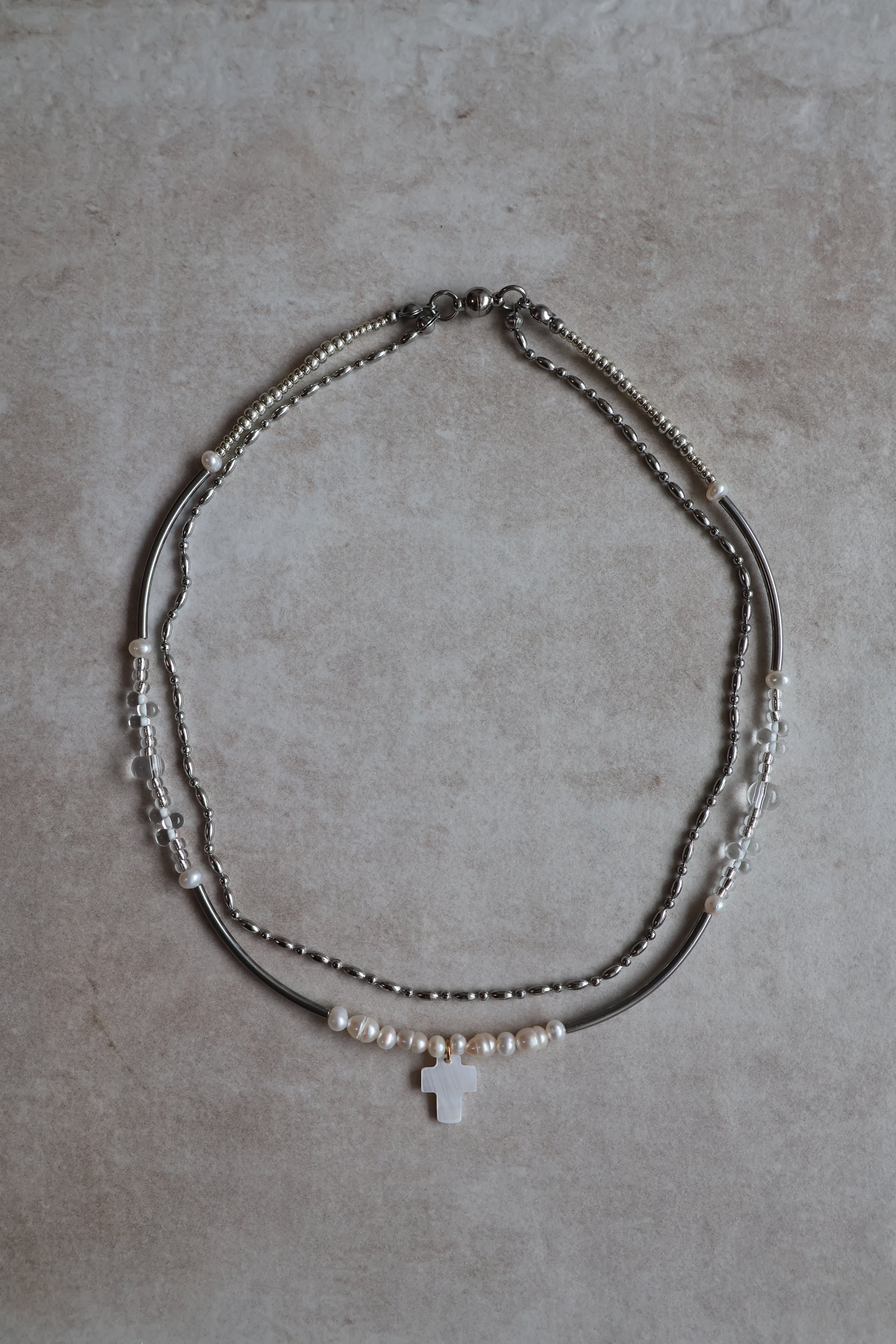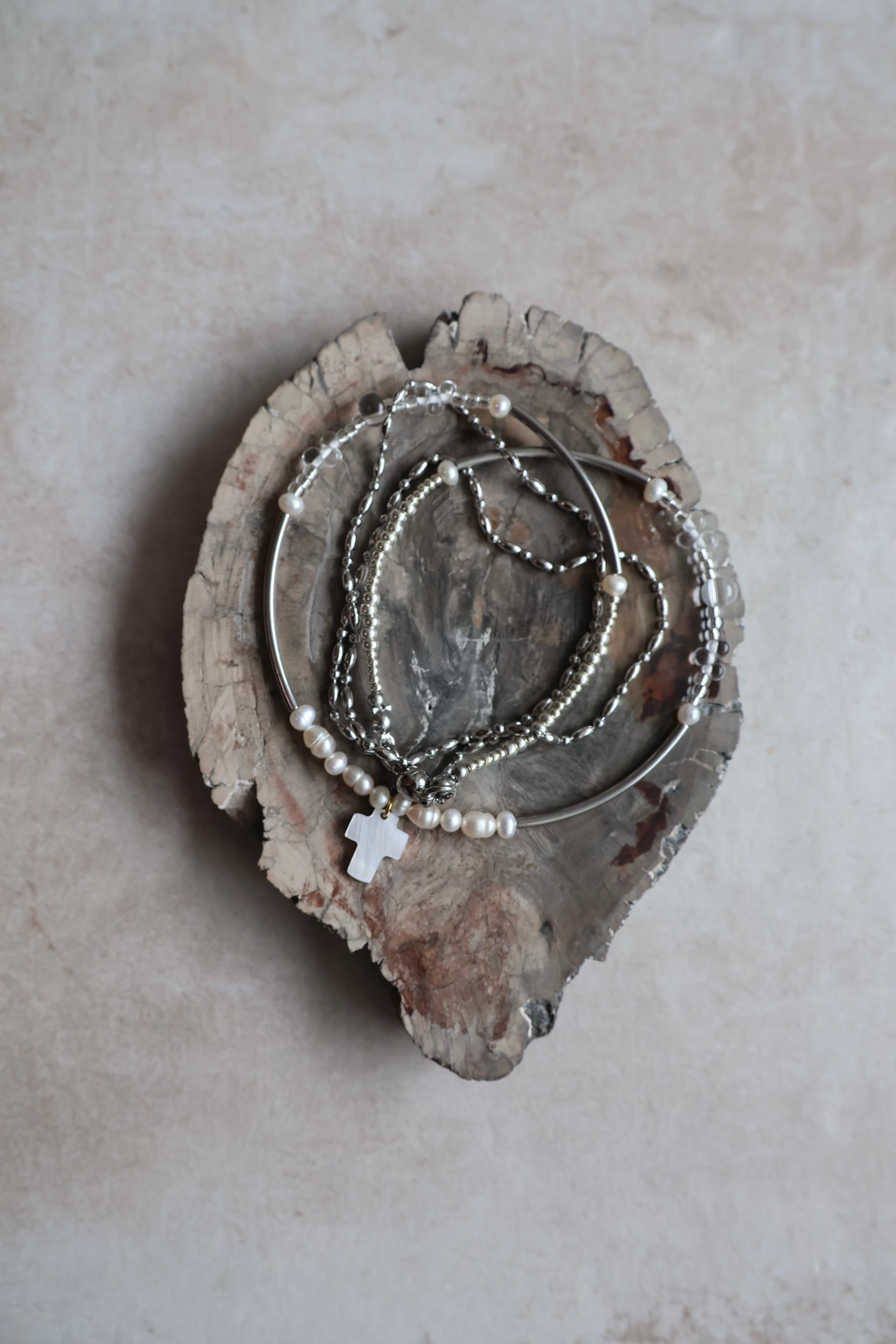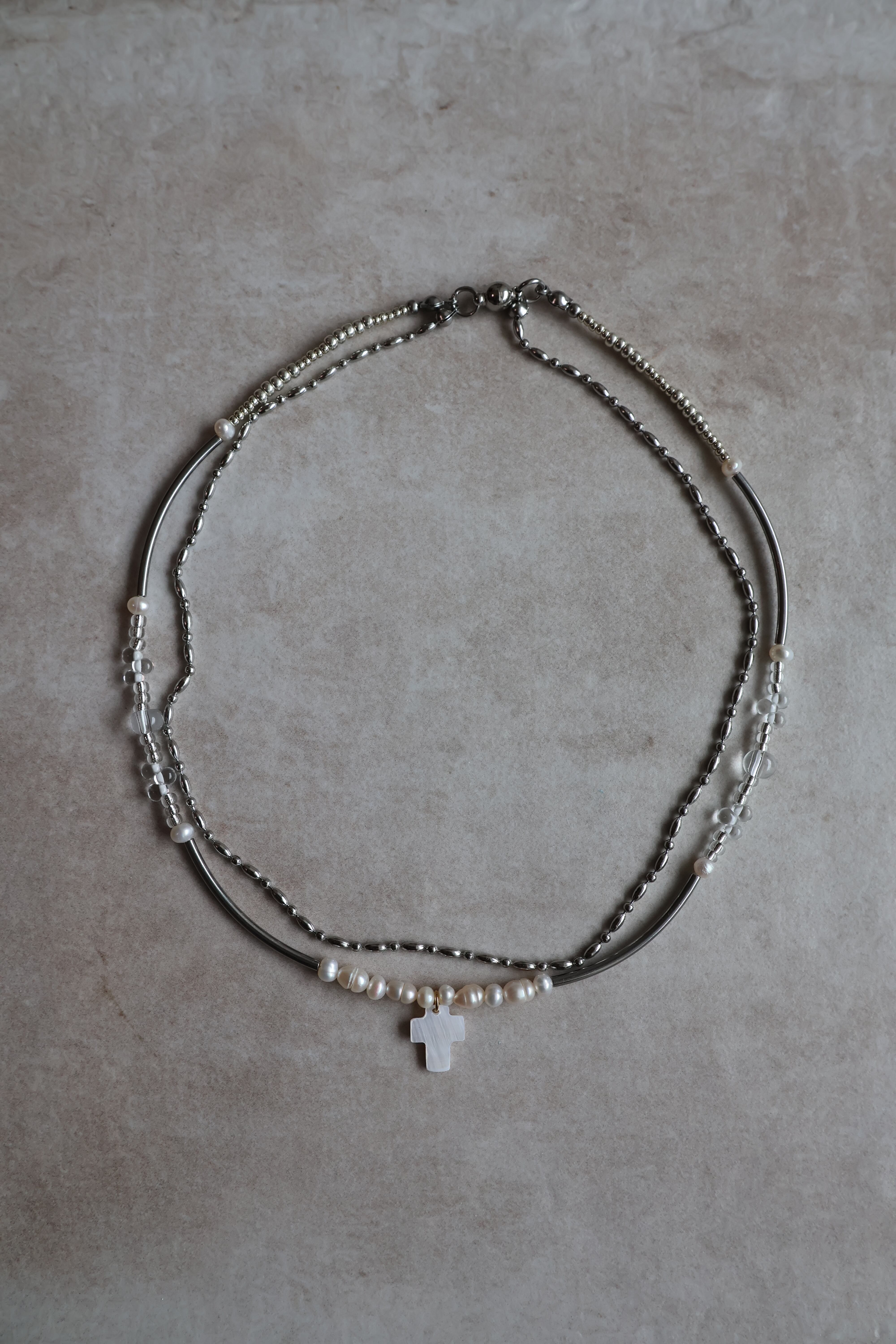 淡水パール、ガラスビーズ、シェルなどを使用しカジュアルなお洋服にも馴染みやすいデザインに。