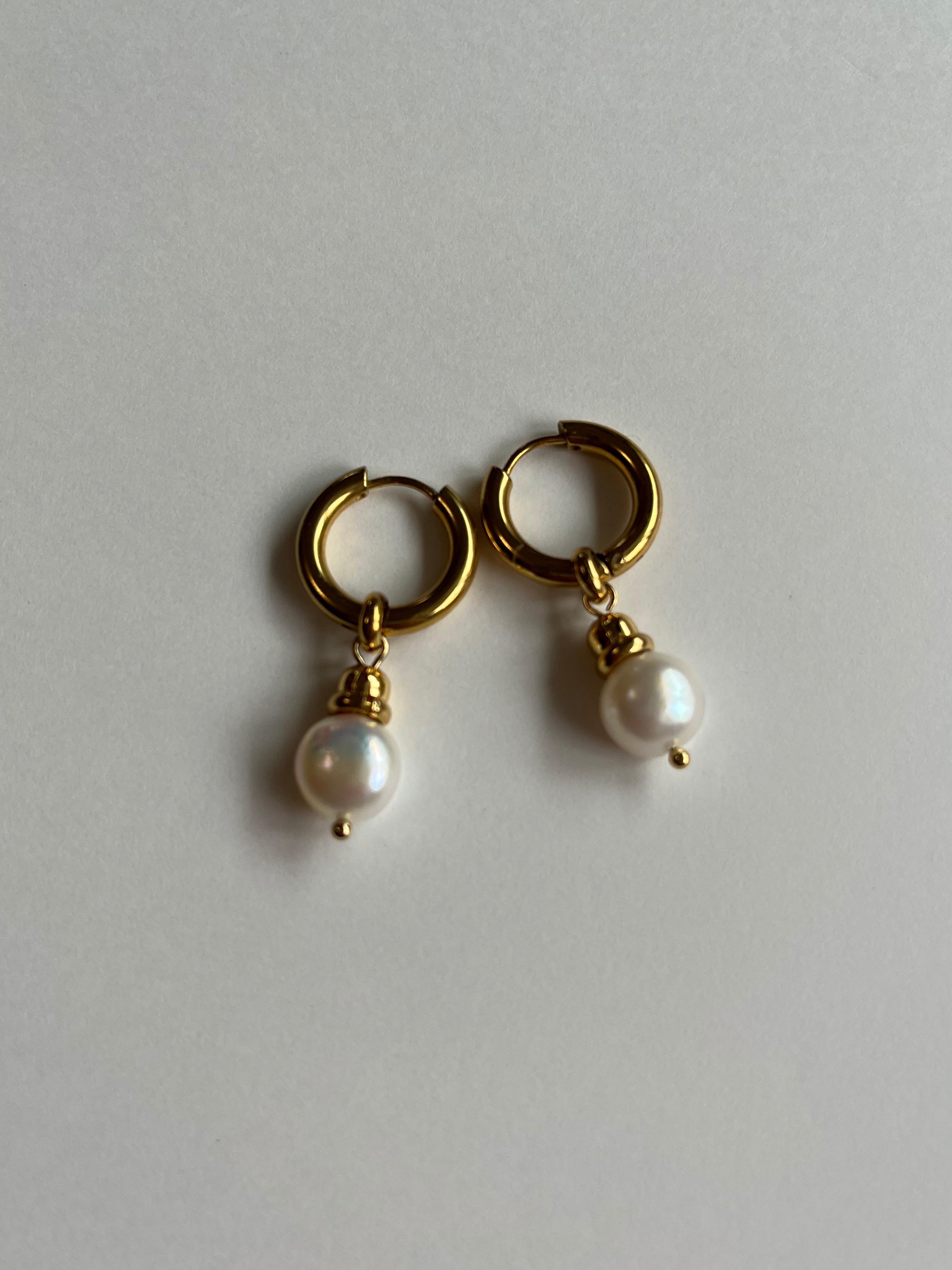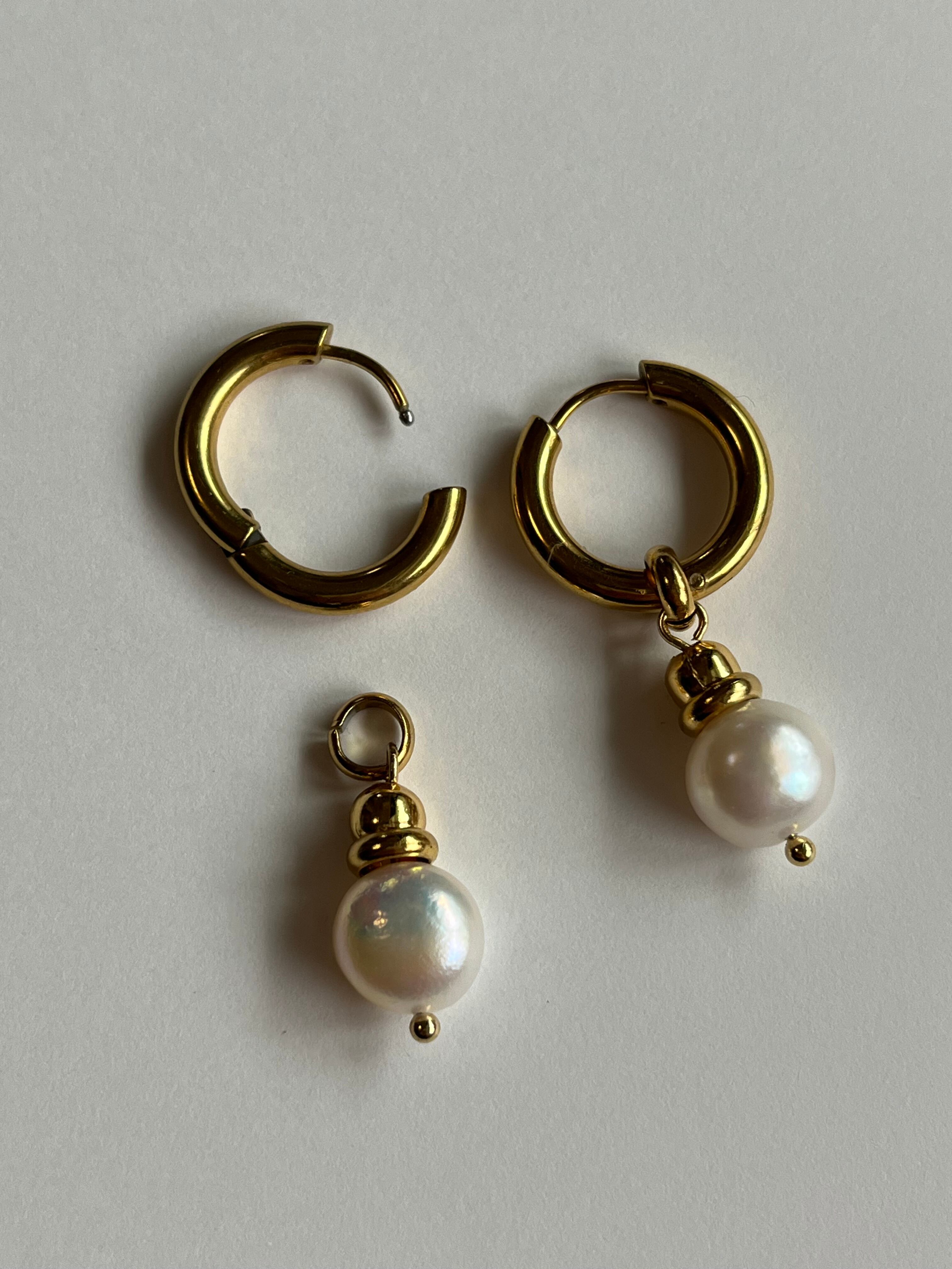 人気のサージカルステンレスのフープピアスにパールぶら下げて、女性らしさもプラスしたピアス☆カジュアルなお洋服にも合わせやすく、Tシャツやトレーナーなどにも相性ピッタリ♡
