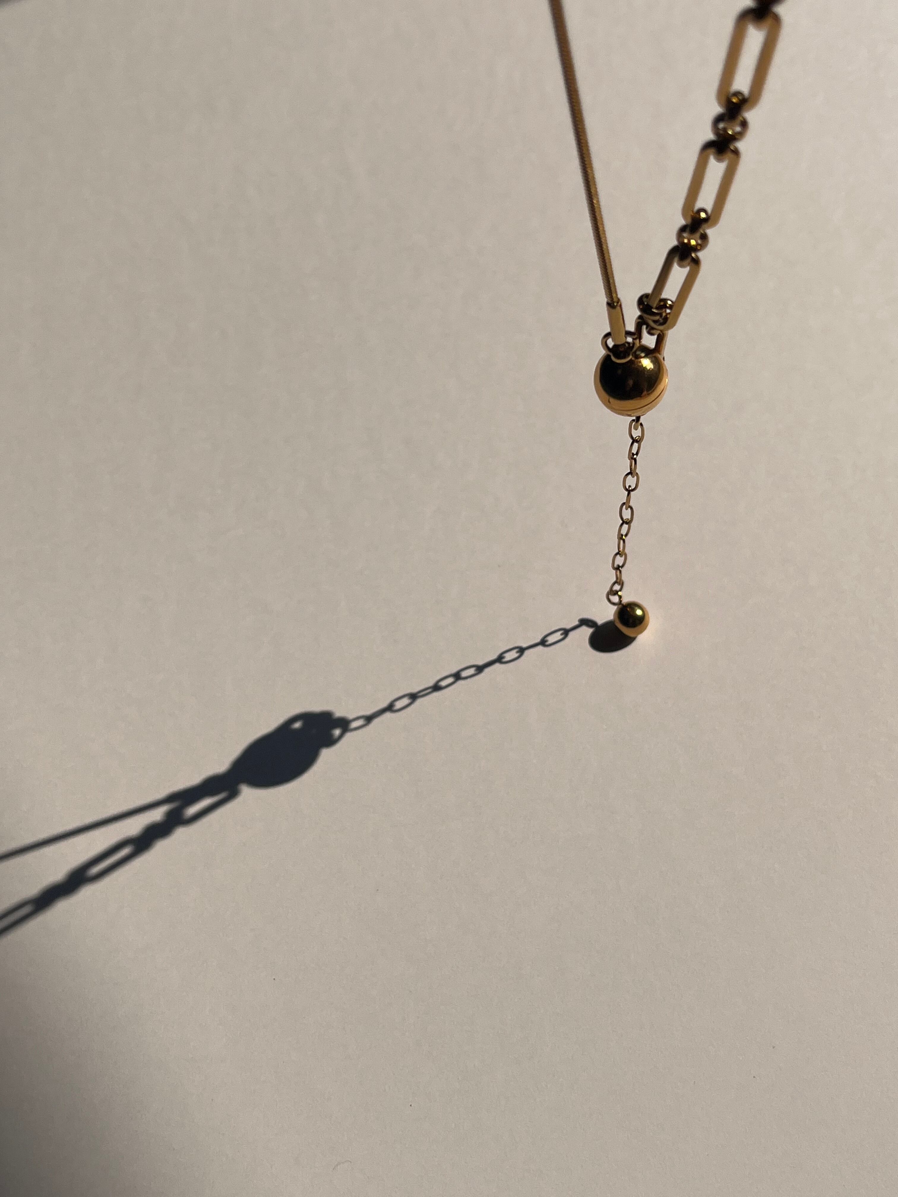 種類の違うチェーンを組み合わせたロングタイプのネックレス。