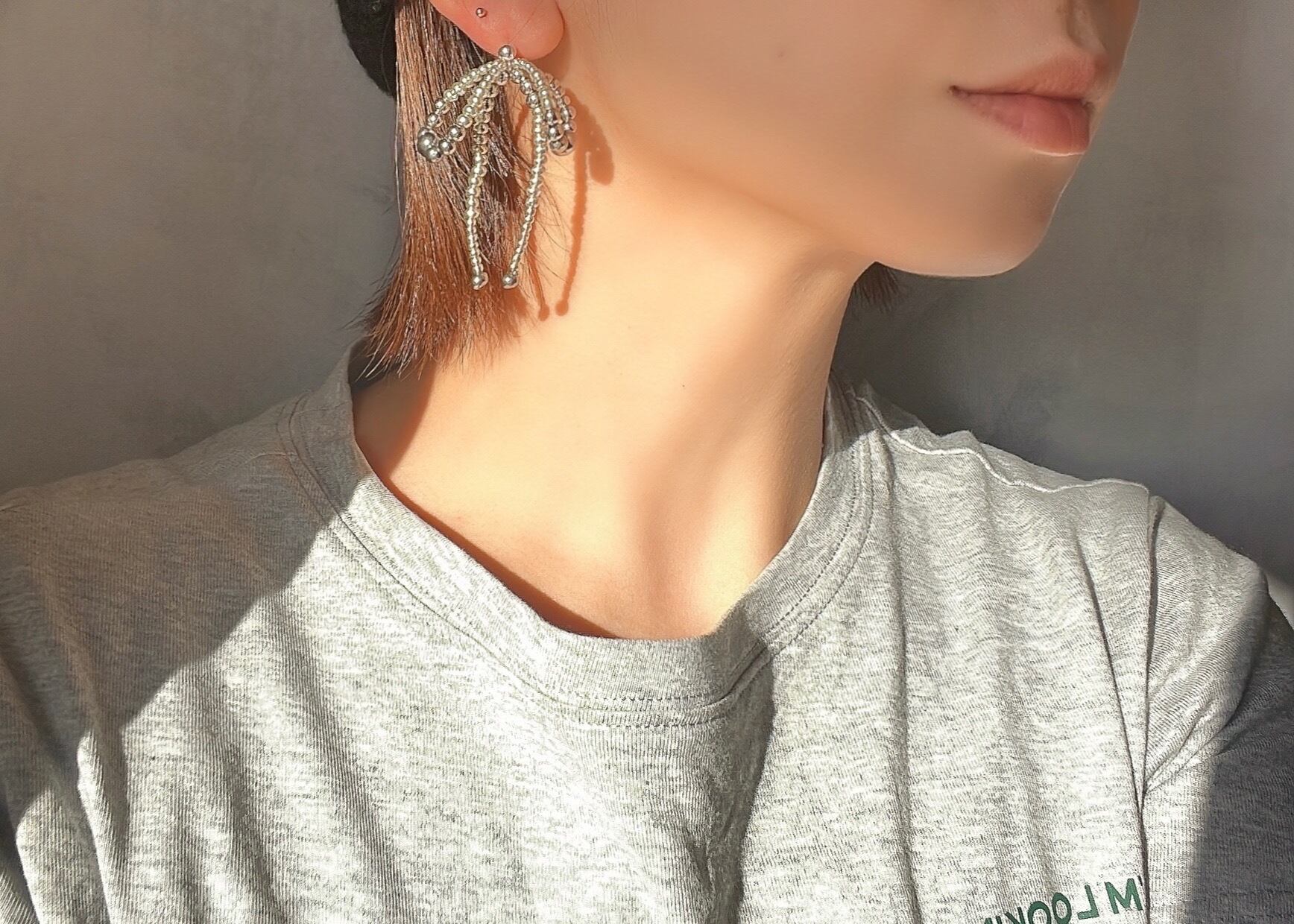 クタッとリボンが垂れるフォルムで可愛くなりすぎない、大人の女性もつけやすいデザインに仕上げました。カジュアルなお洋服にも合わせやすく、幅広いスタイリングにお使いいただけます。