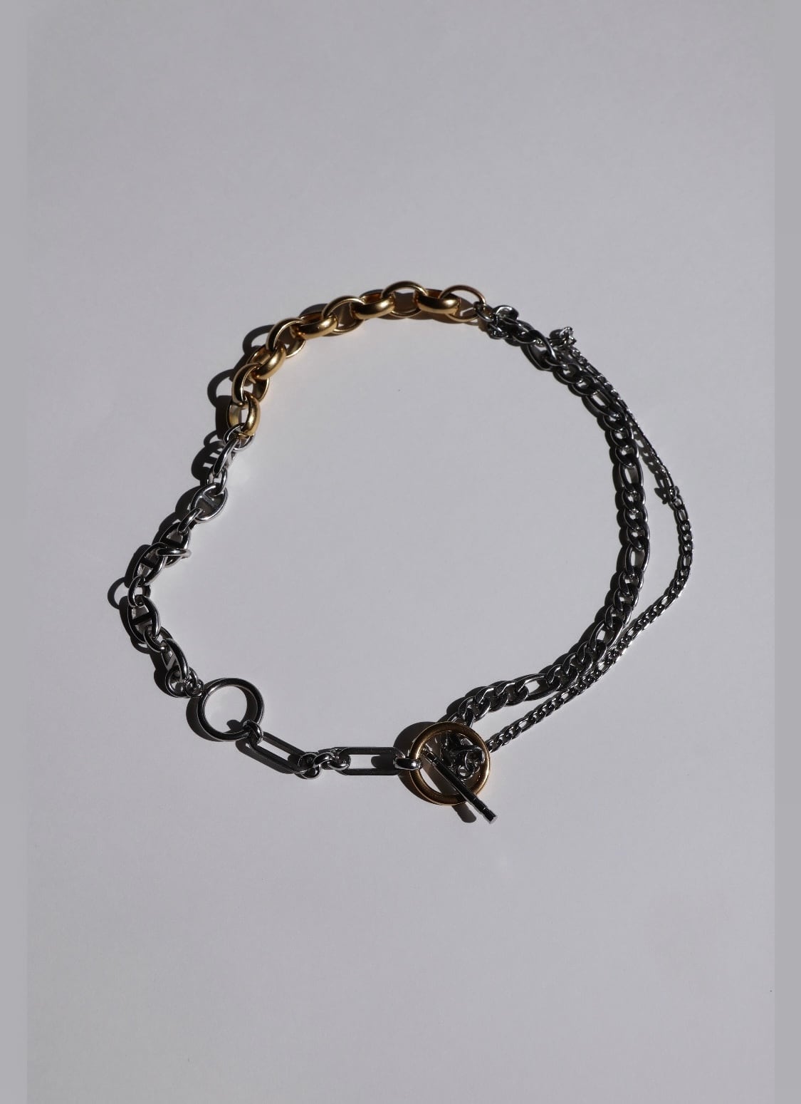 形の違うチェーンを組み合わせて、つける角度によって違うデザインに見えるネックレスに♪